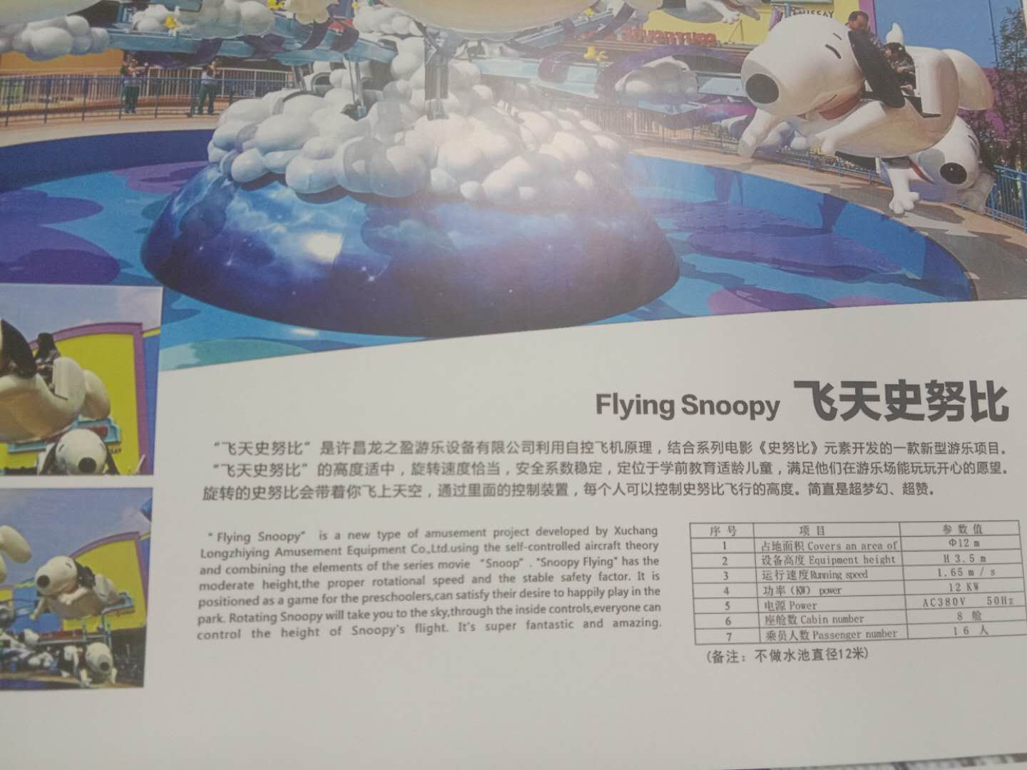 飛天史努比是許昌龍之盈游樂設(shè)備有限公司利用自控飛機原理,結(jié)合系列電影《史努比》元素開發(fā)的一款新型游樂項目。飛天史努比的高度始終,旋轉(zhuǎn)速度適當(dāng),安全系數(shù)穩(wěn)定,定位于學(xué)前教育適齡兒童,滿足他們在游樂場能玩玩開心的愿望,旋轉(zhuǎn)的史努比會帶著你飛上天空,通過里面的控制裝置,每個人都可以控制史努比飛行的高度,簡直是超級夢幻、超贊的哦。